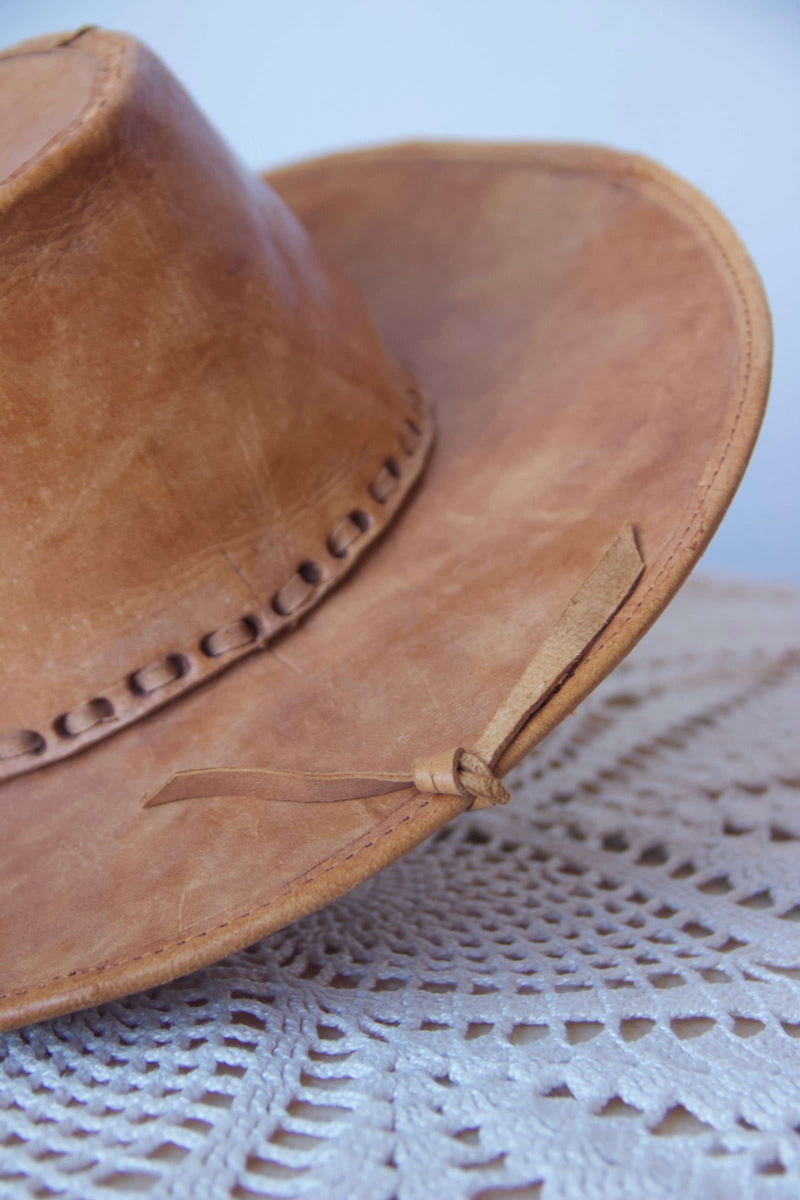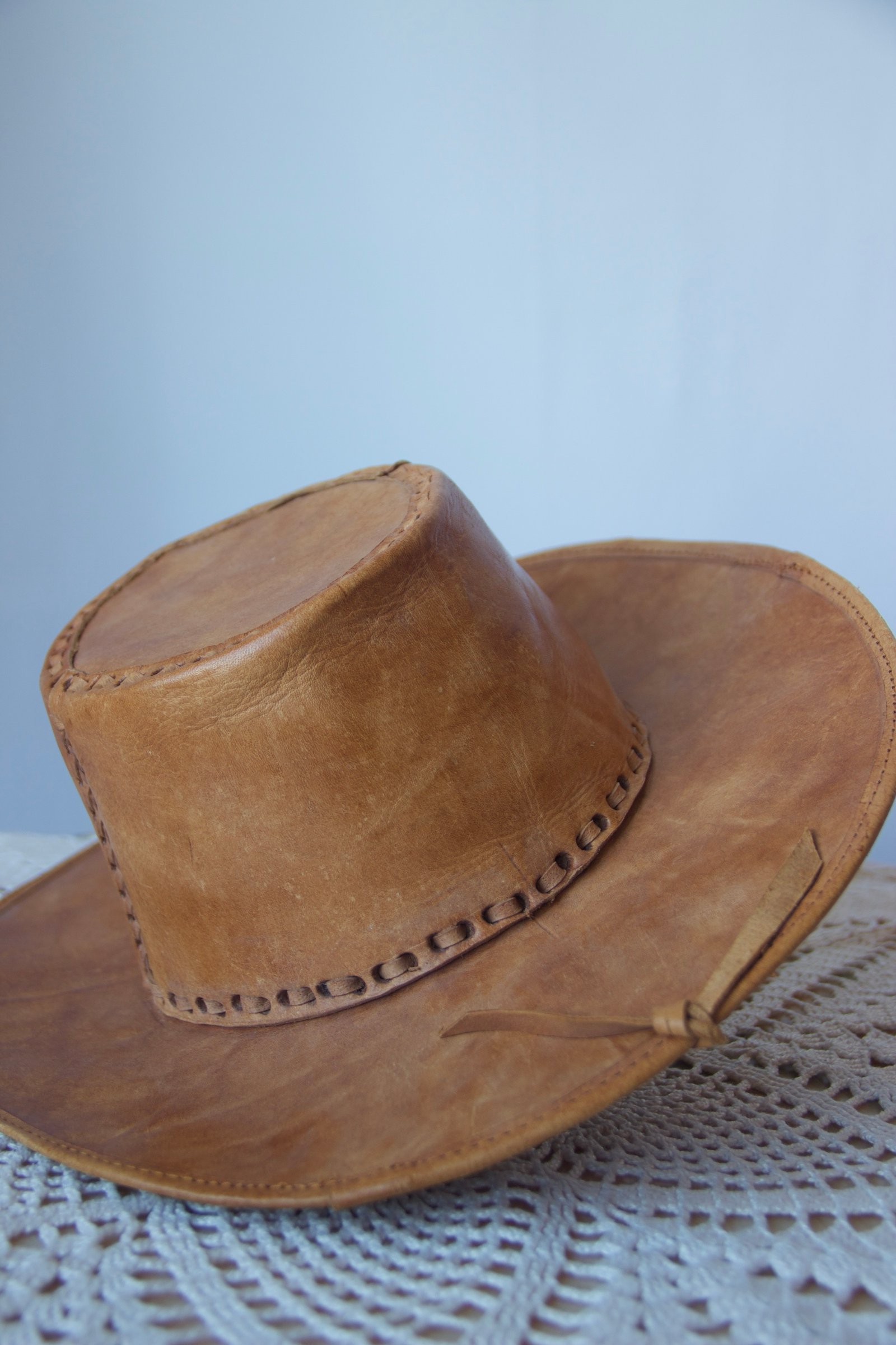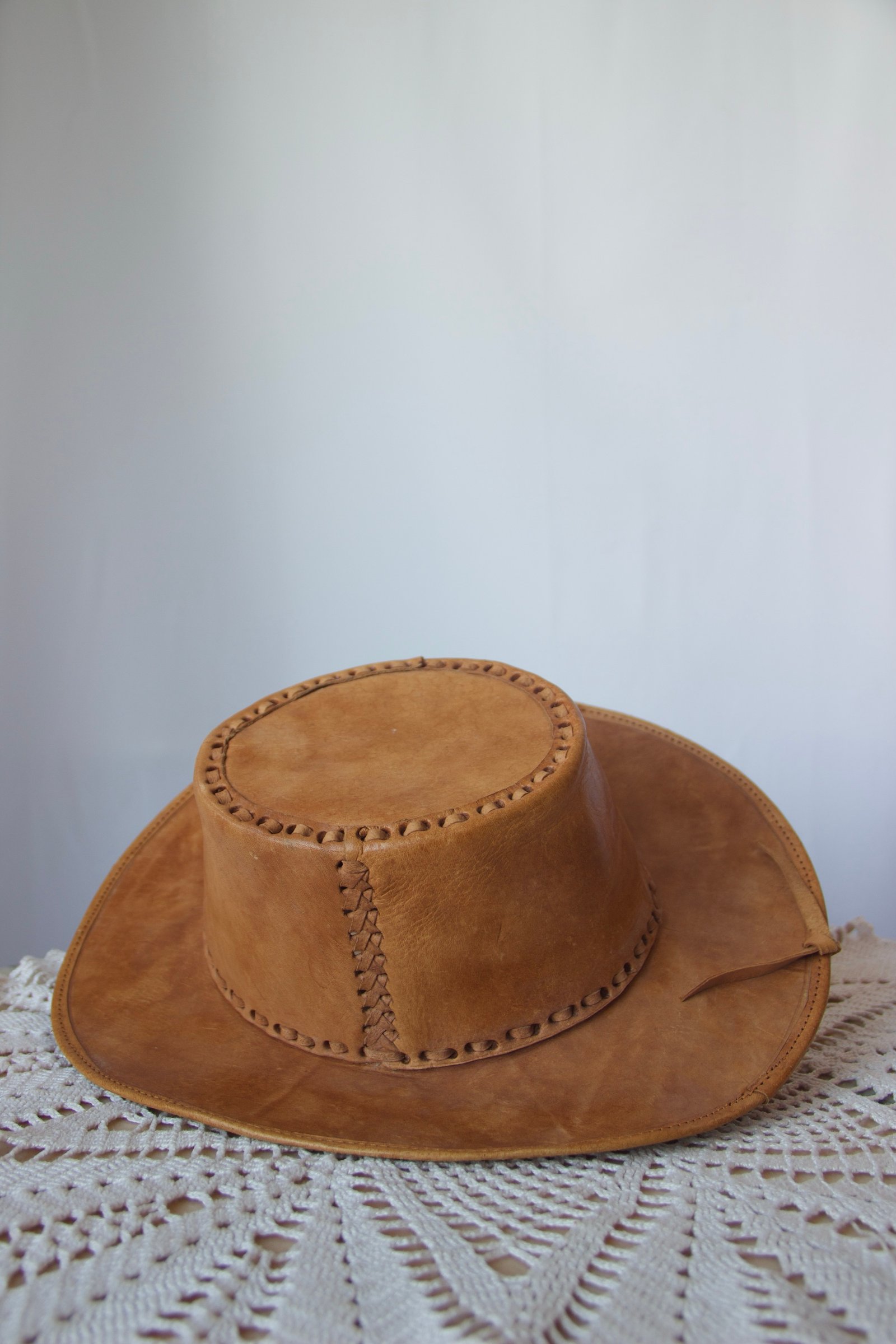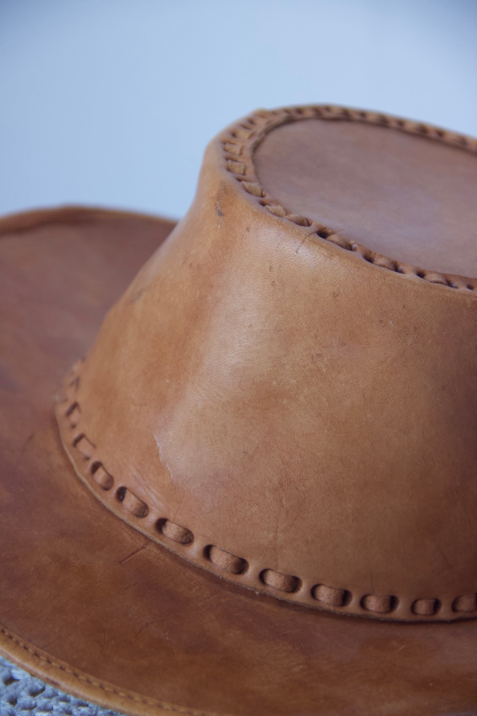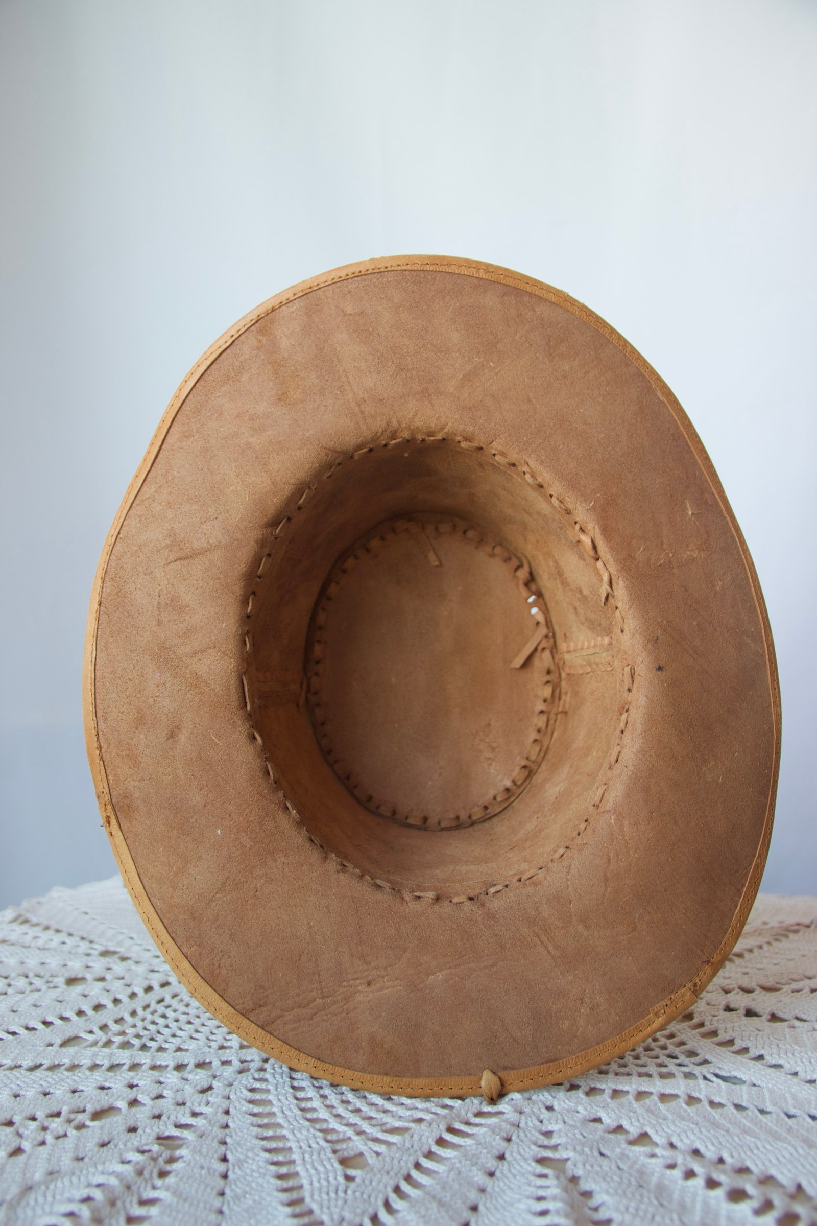 Chapeau vintage en cuir suédé à l’allure authentique, au style western affirmé.