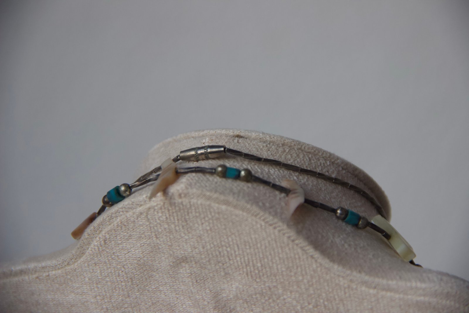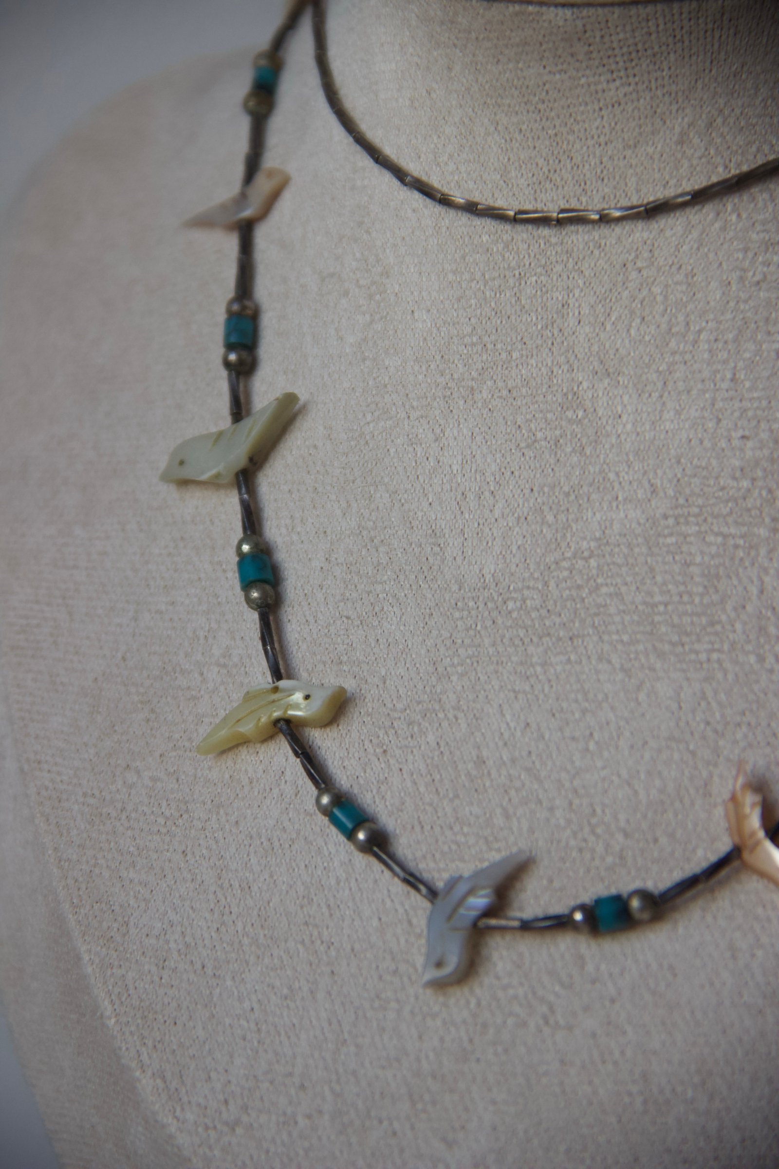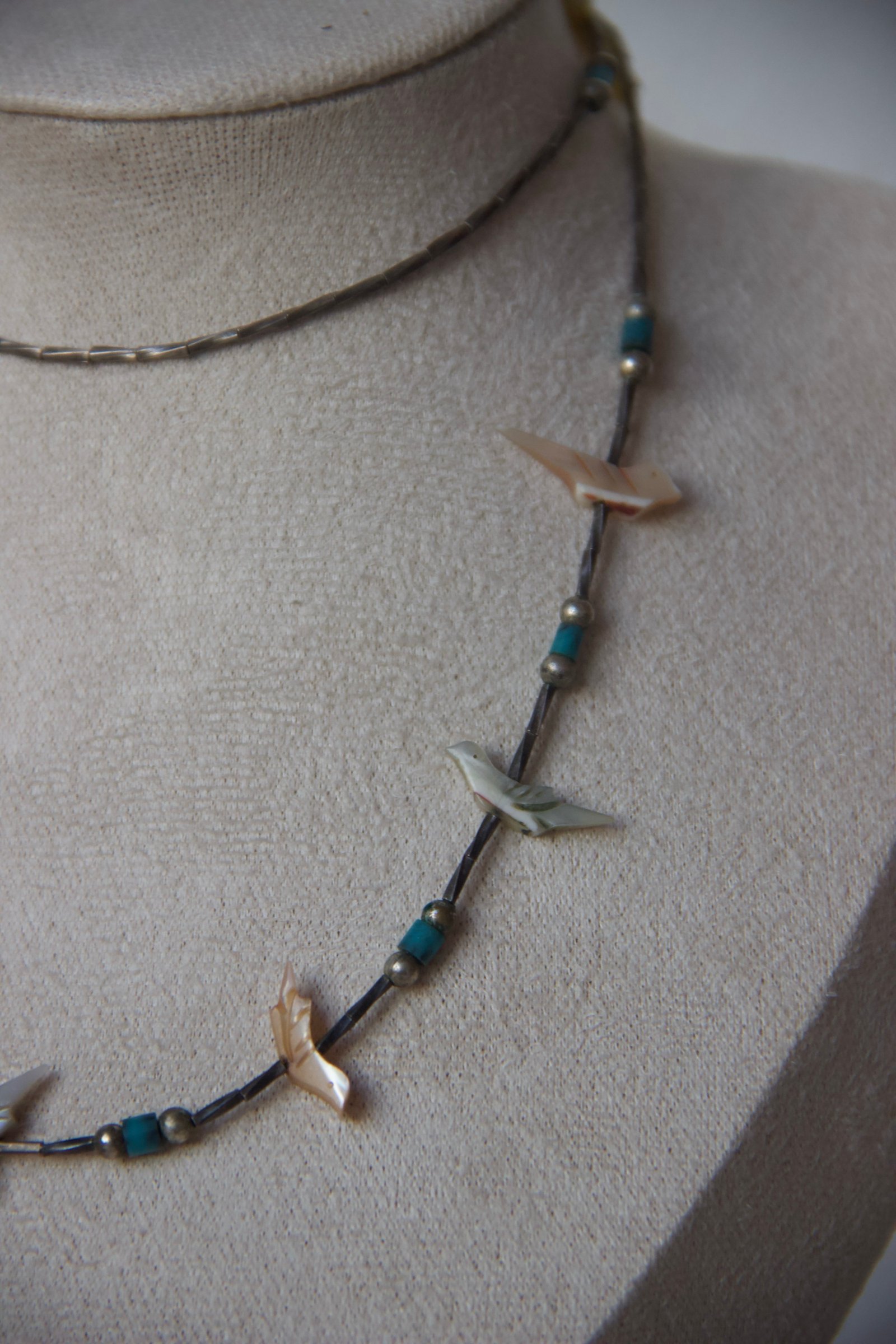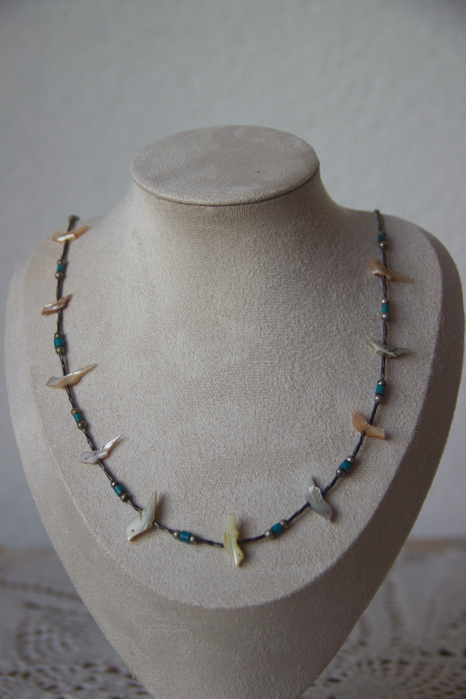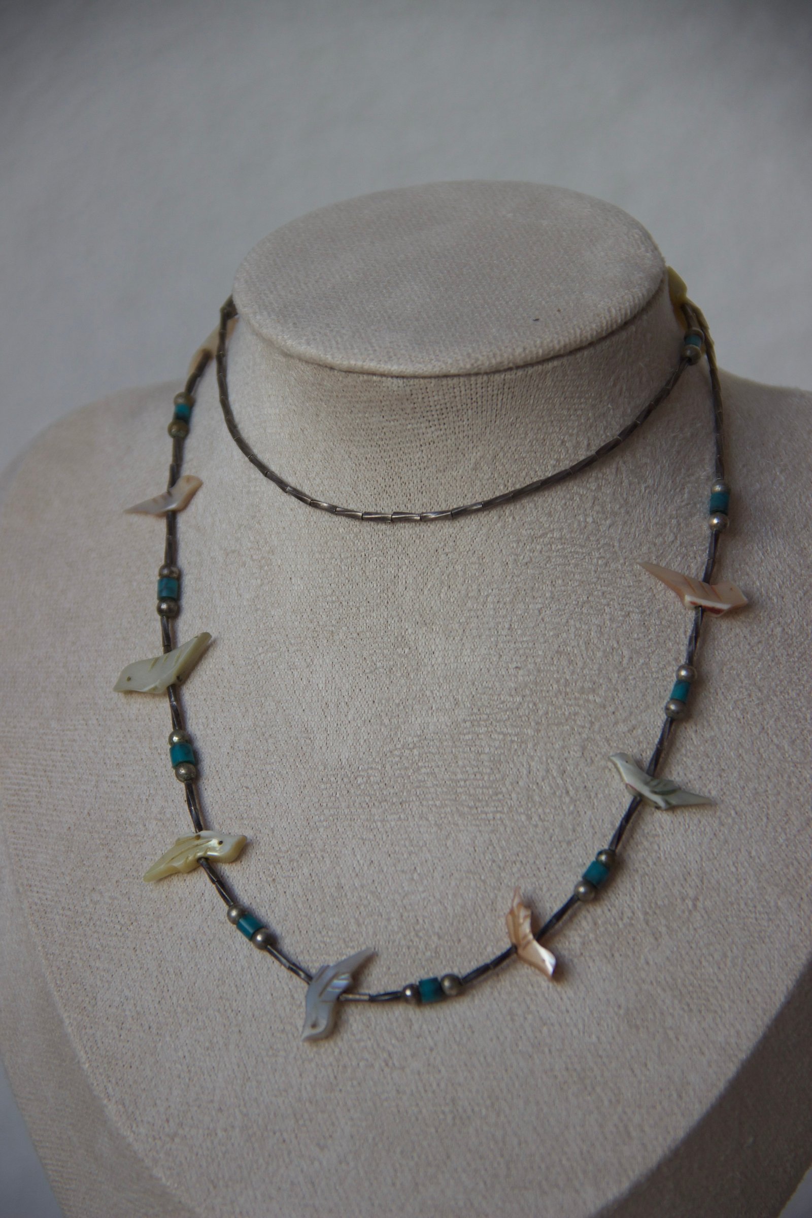 Ce collier délicat est composé de fines perles en argent sterling, ponctuées de petites perles turquoise et de motifs d’oiseaux sculptés en nacre (style « fetish »). L’ensemble crée un équilibre élégant entre matières naturelles et détails ethniques, évoquant les bijoux traditionnels amérindiens tout en restant une pièce accessible et facile à porter au quotidien.