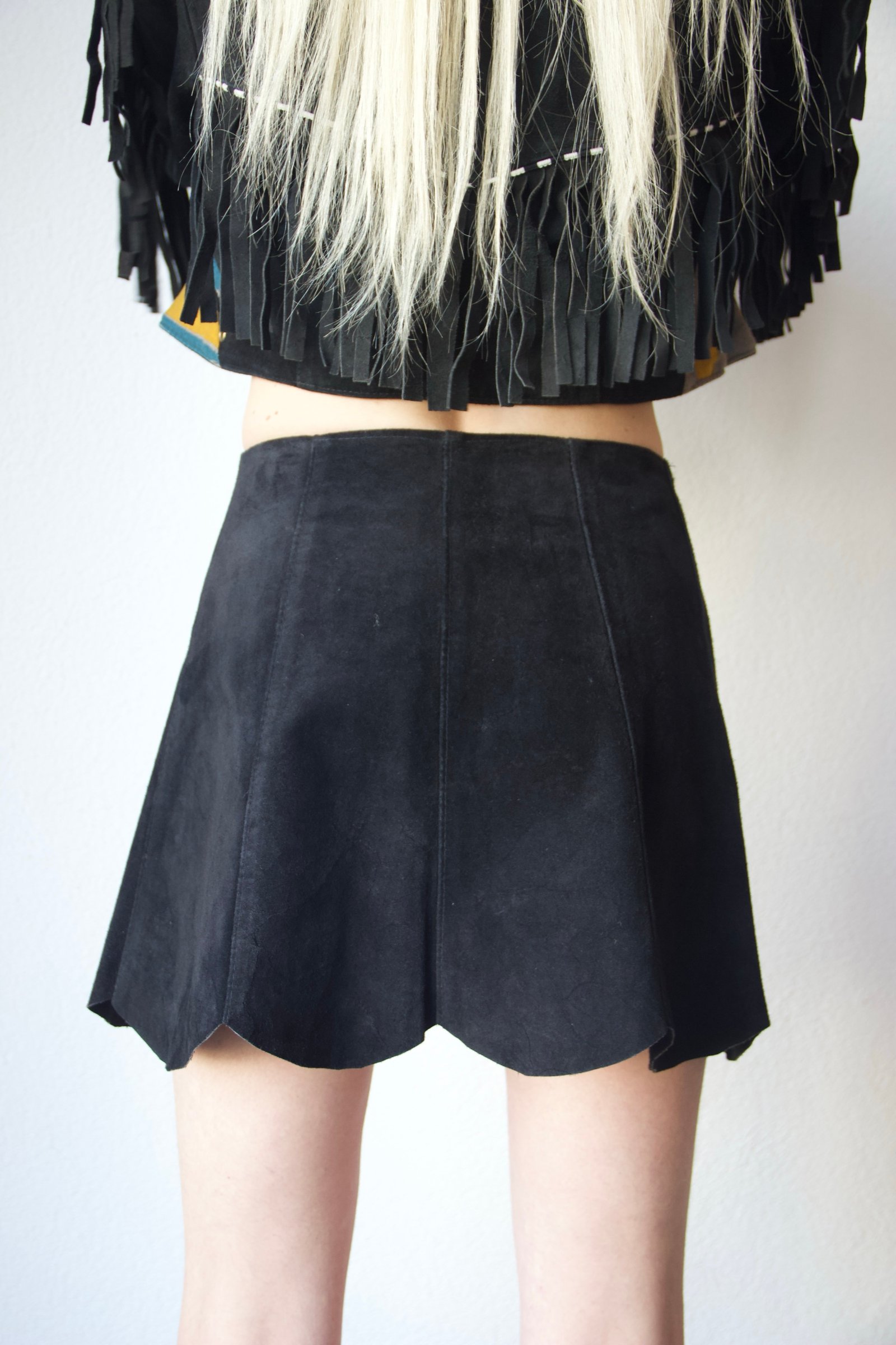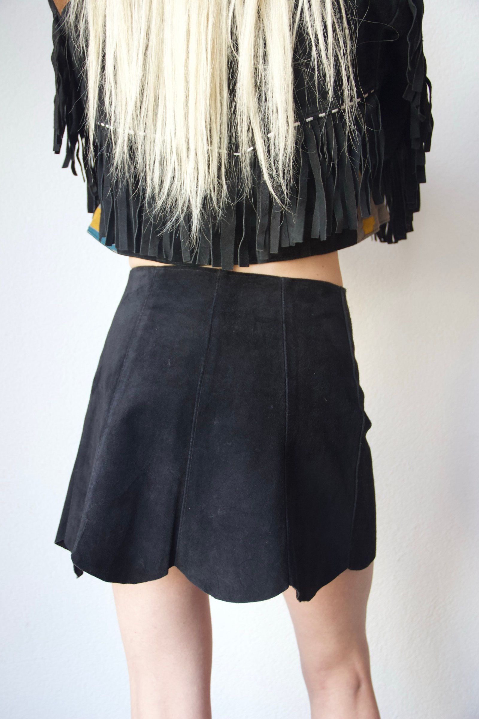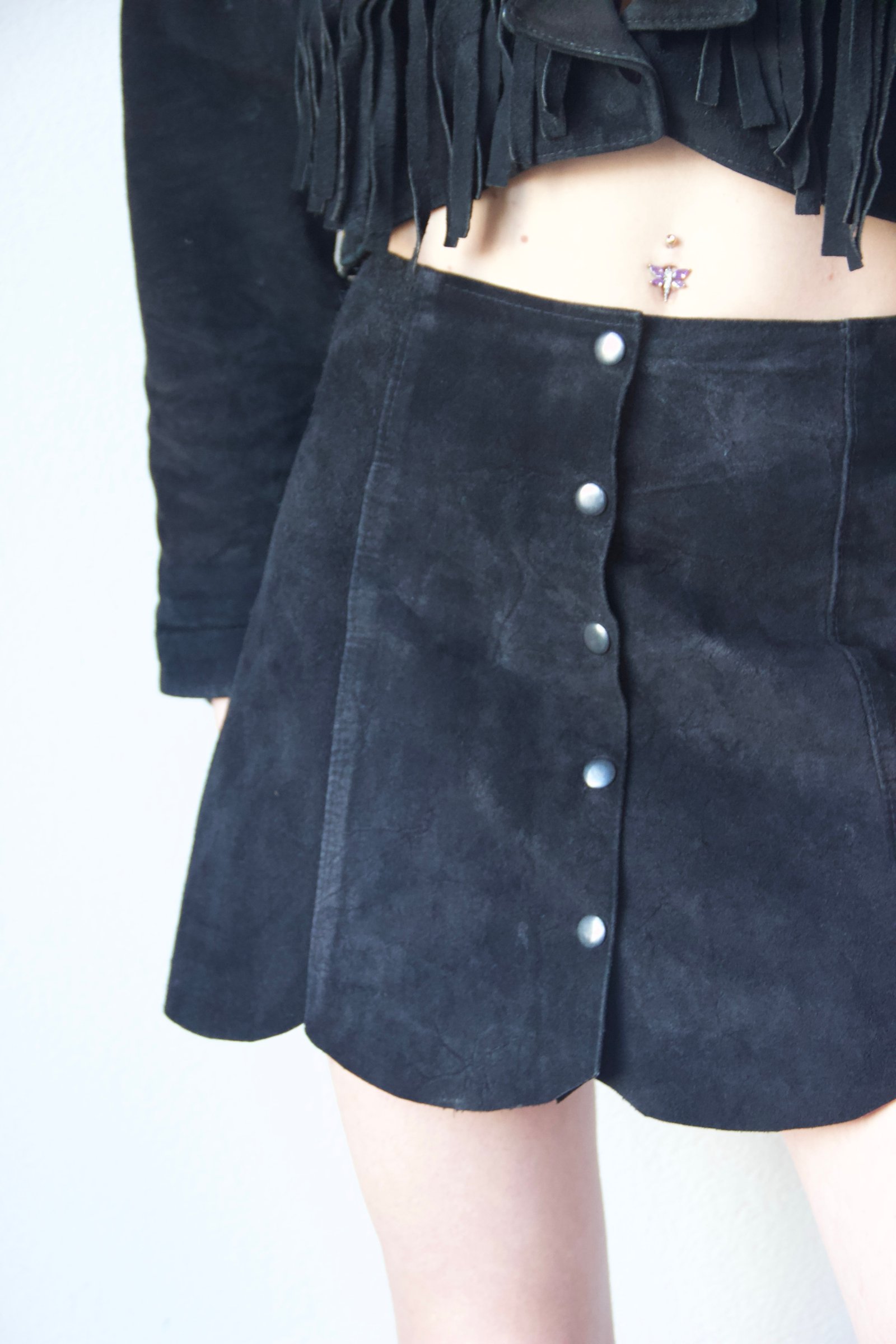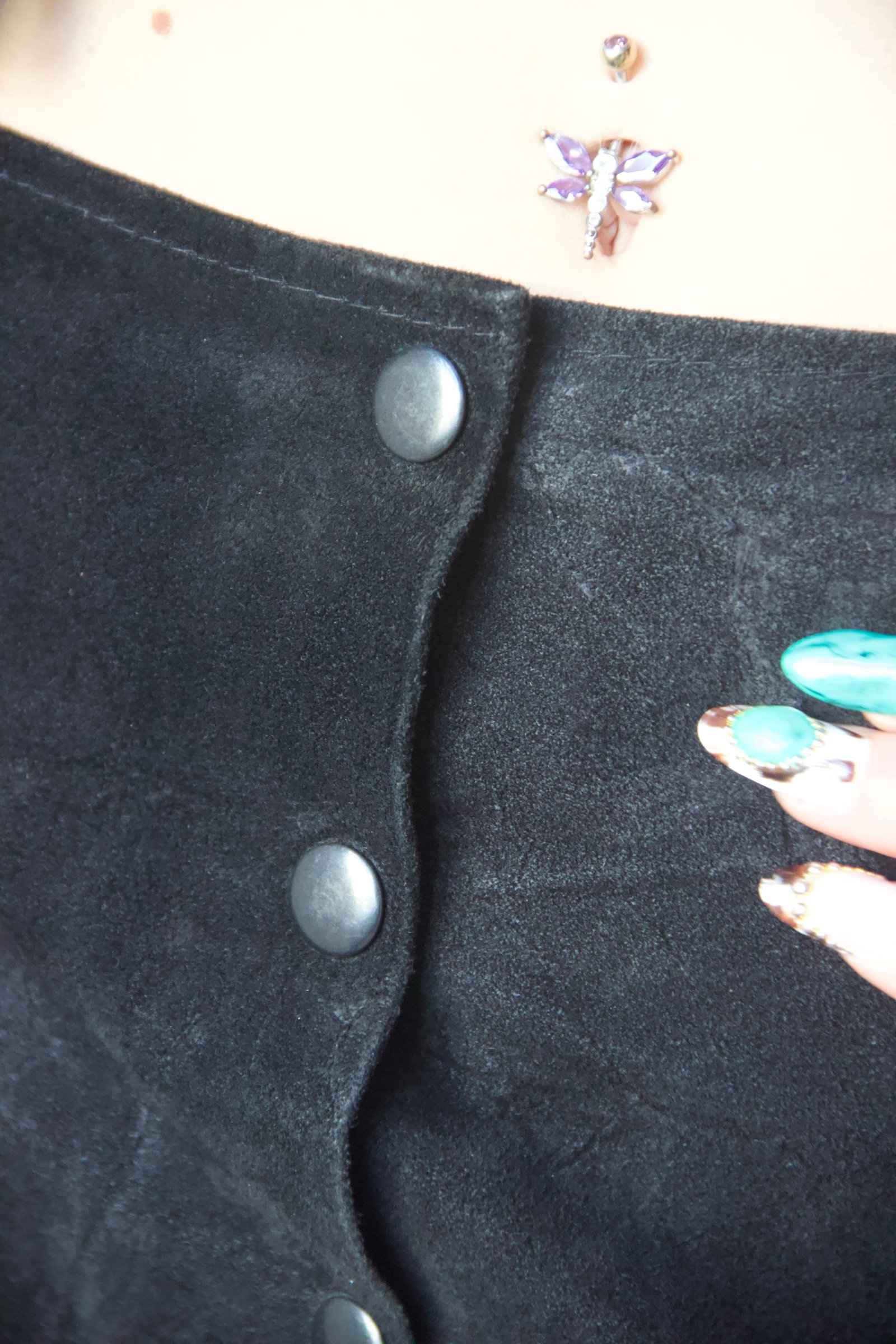 Jupe vintage en cuir noir, au style rétro et féminin.