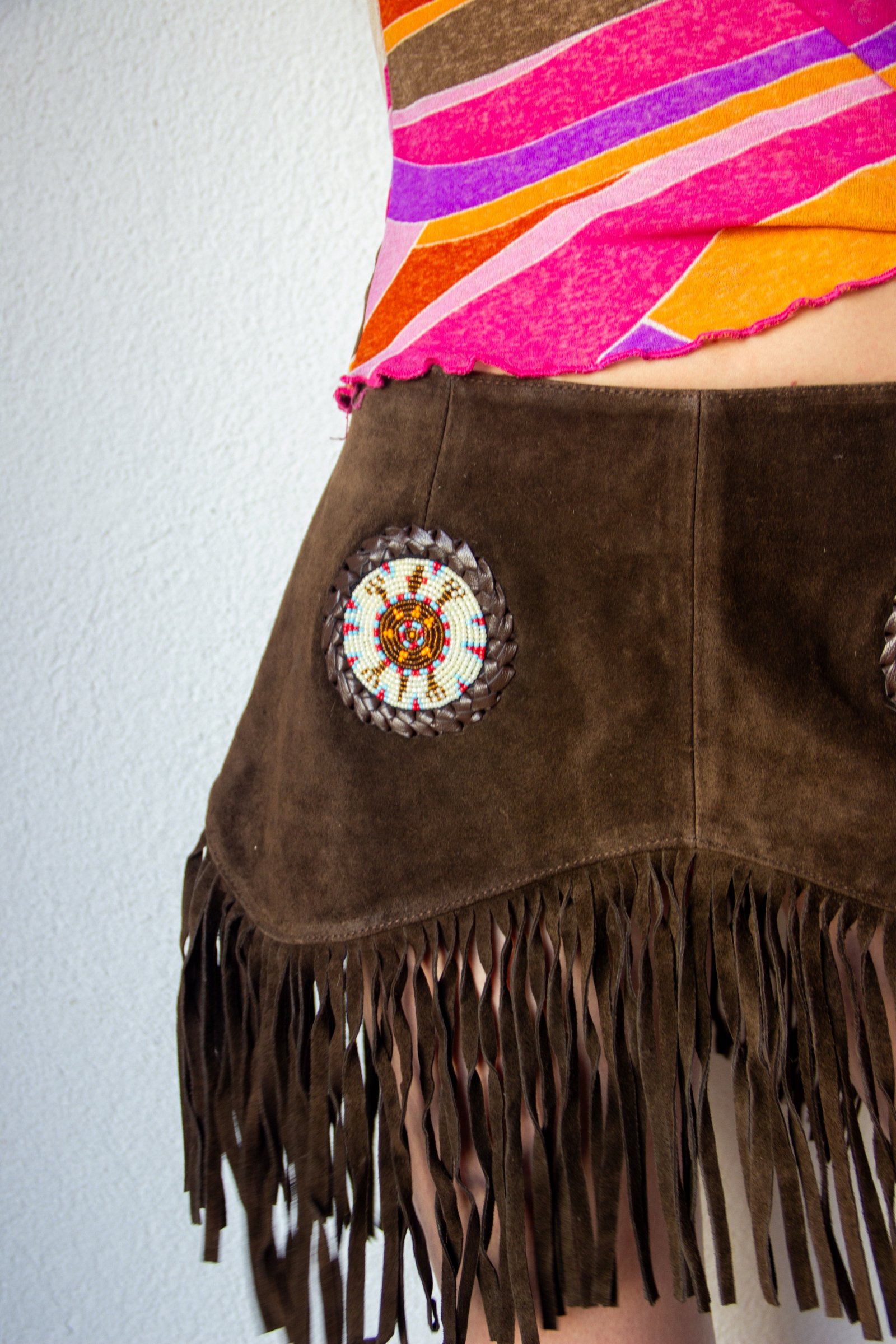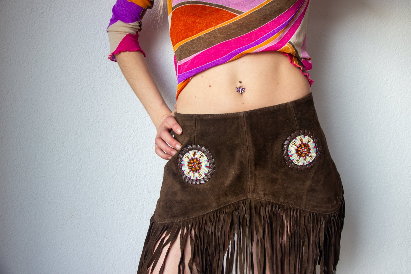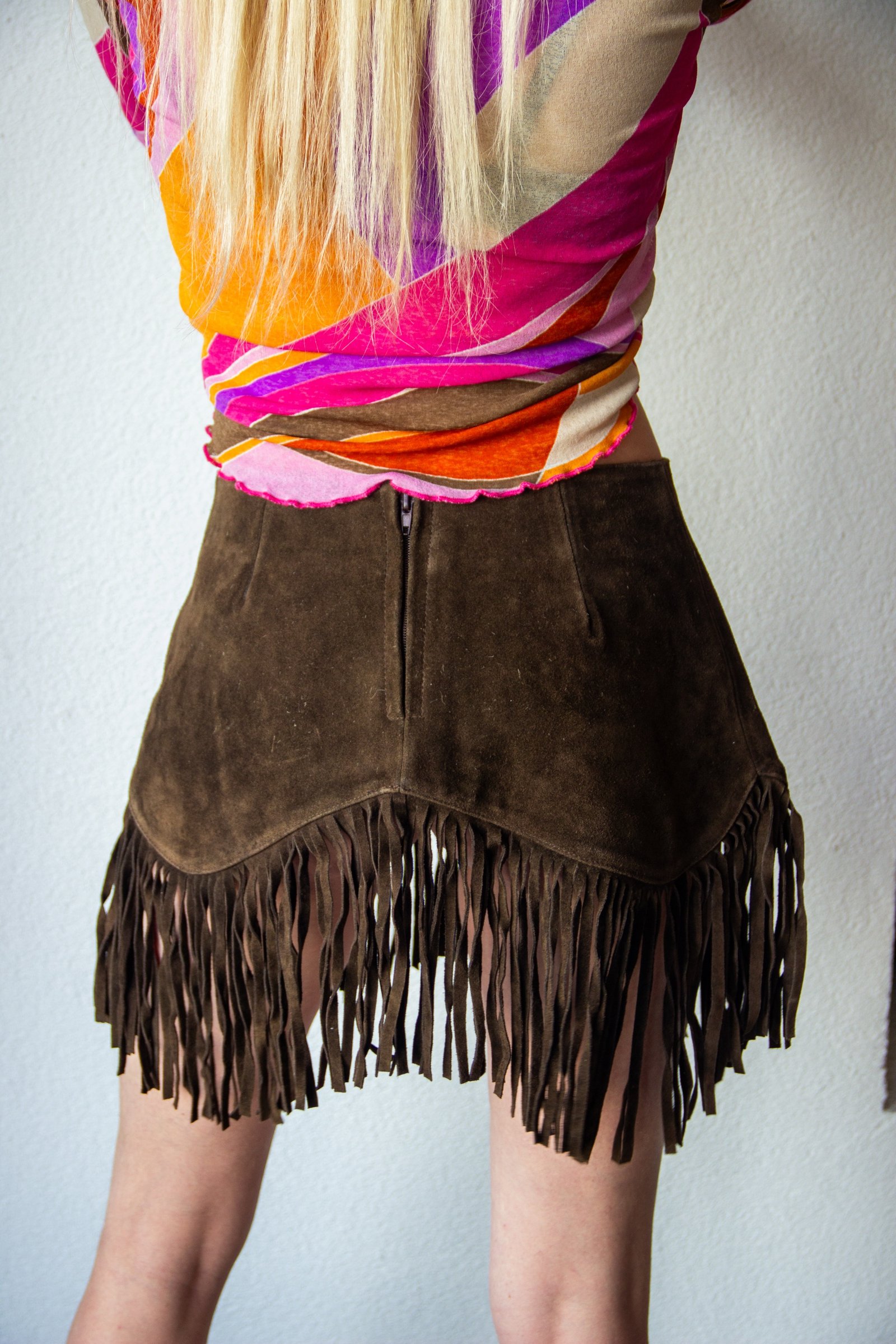 Jupe en daim avec longues franges en mouvement, coupe courte légèrement taille basse qui souligne la silhouette.