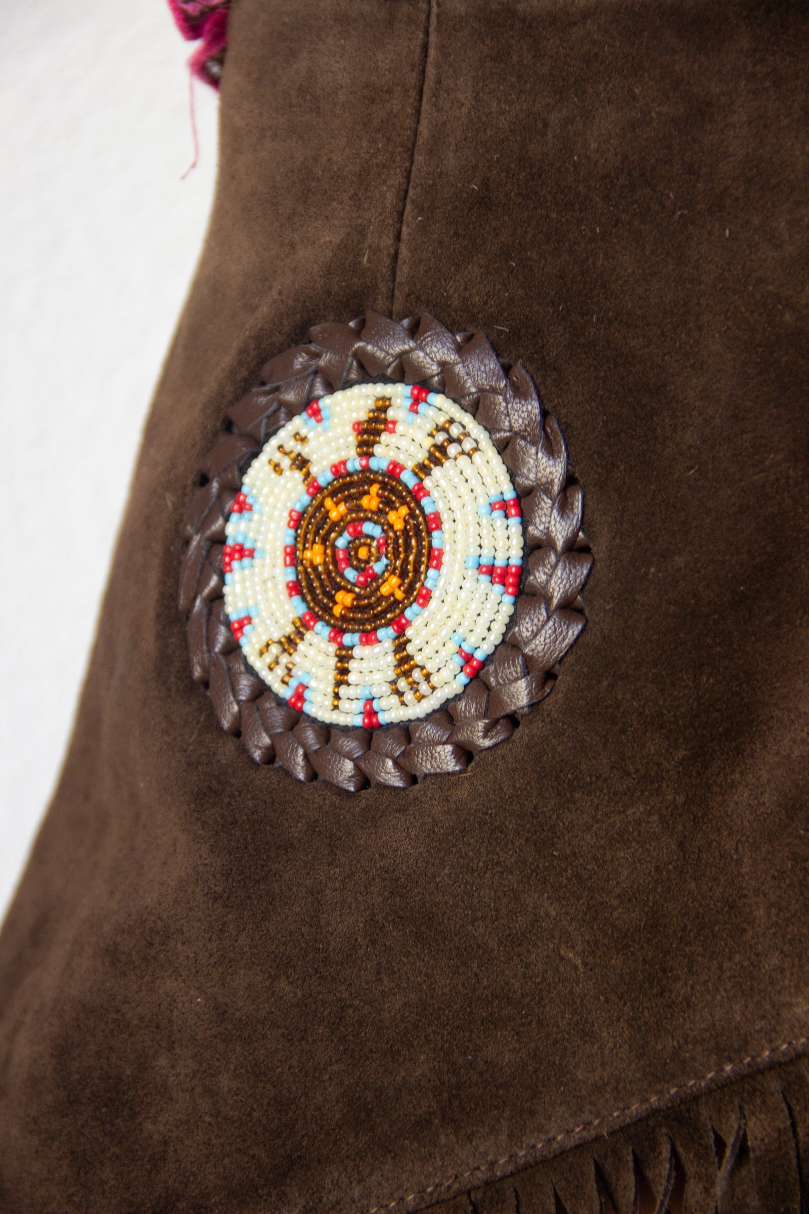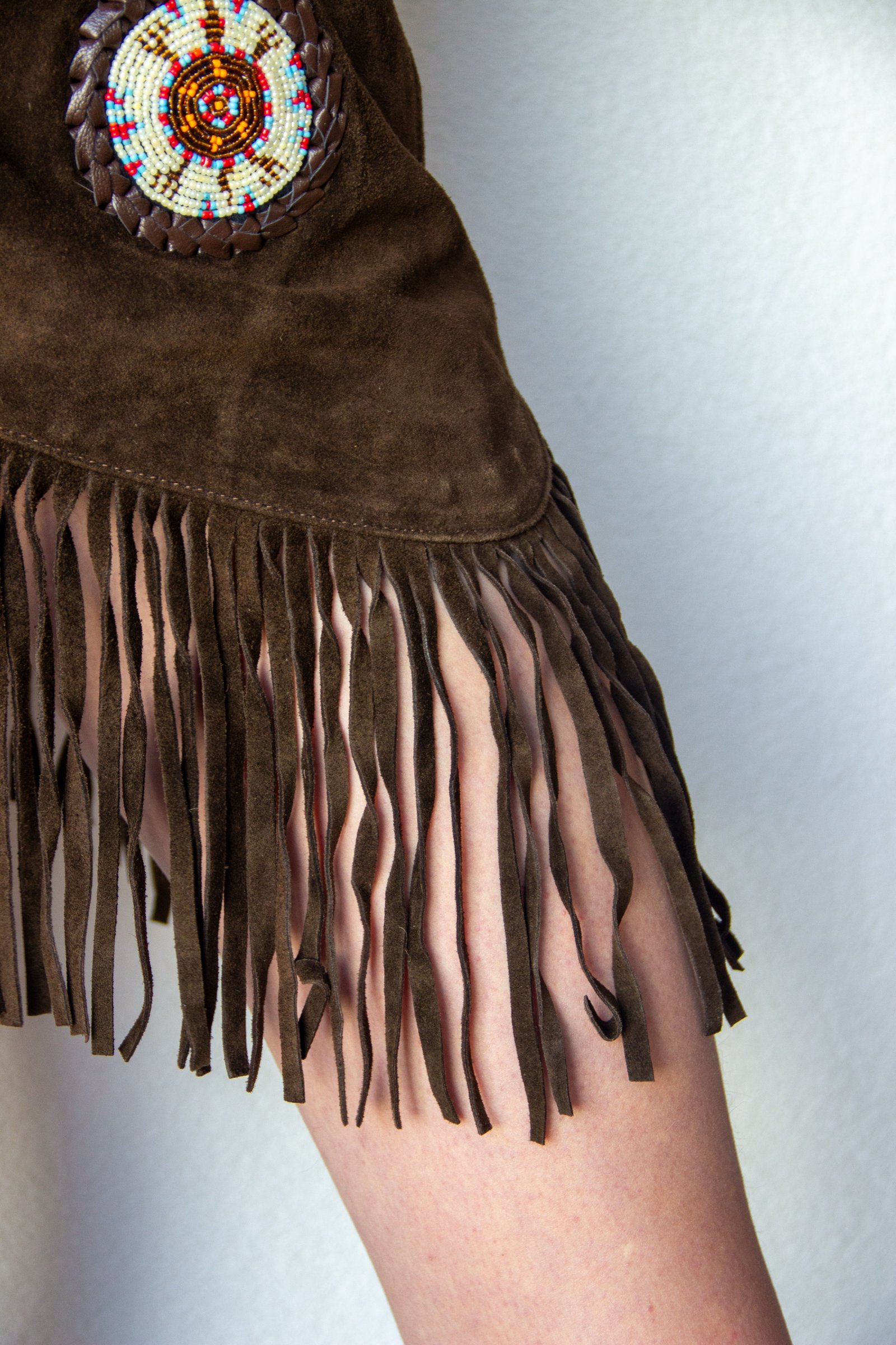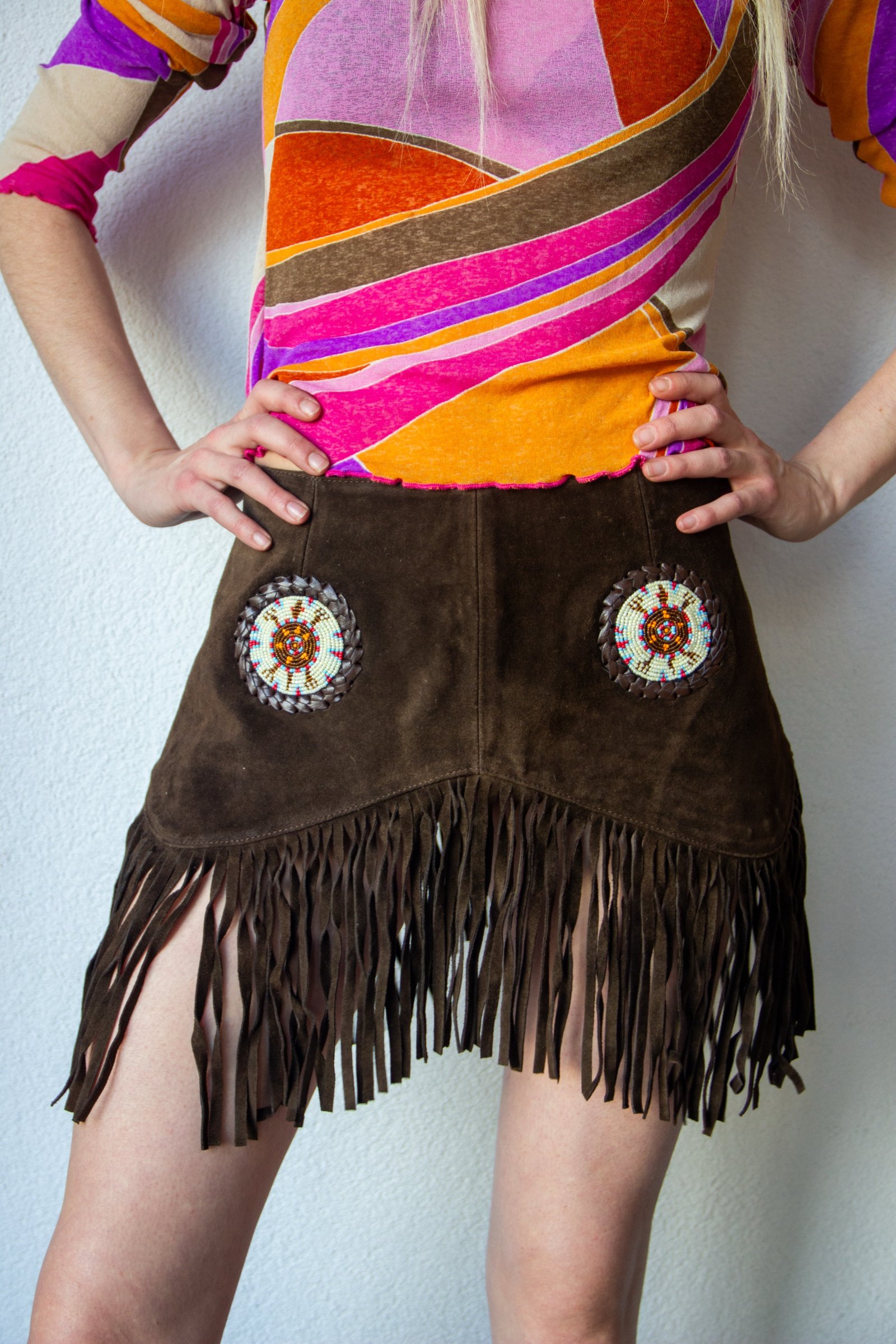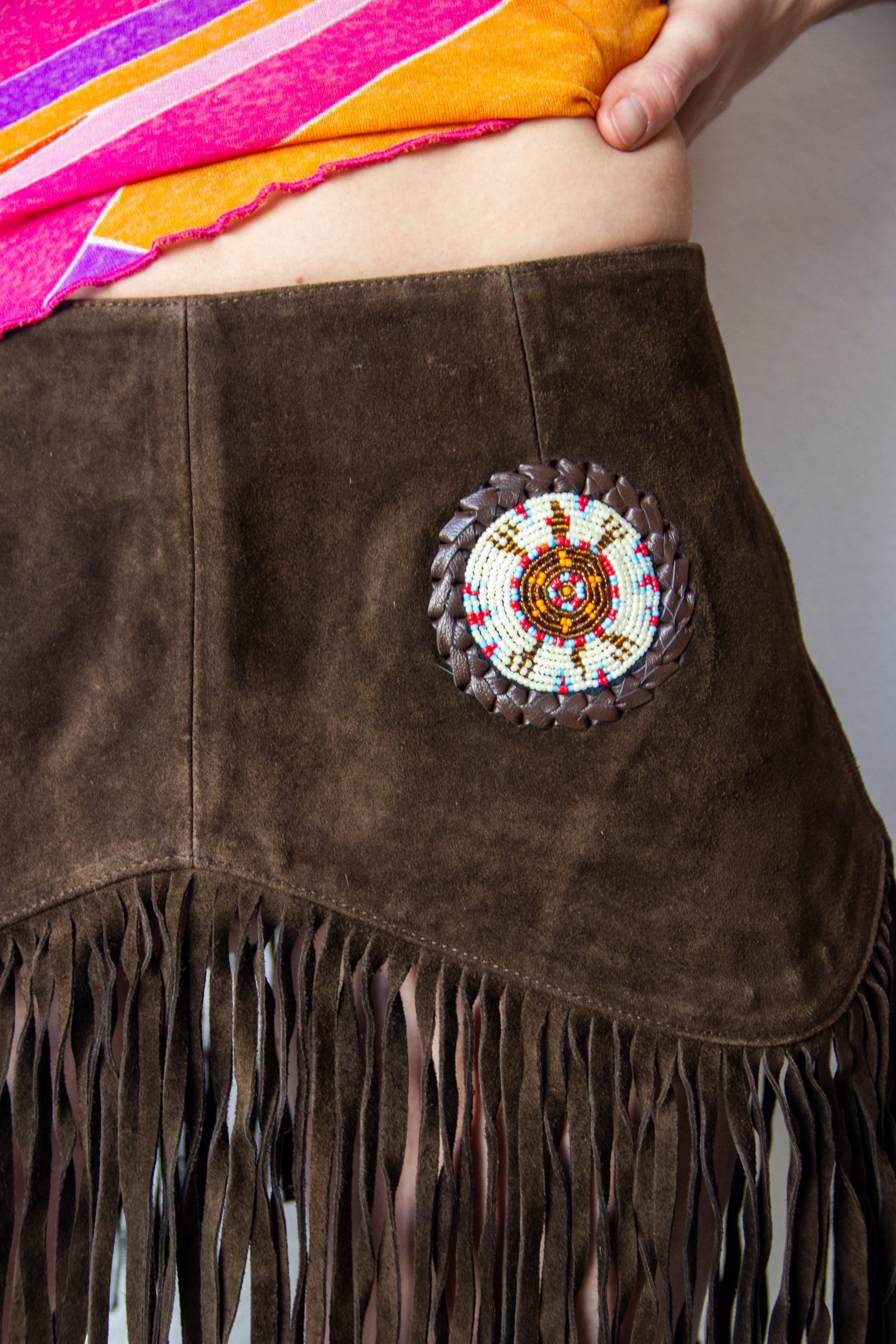 Jupe en daim avec longues franges en mouvement, coupe courte légèrement taille basse qui souligne la silhouette.