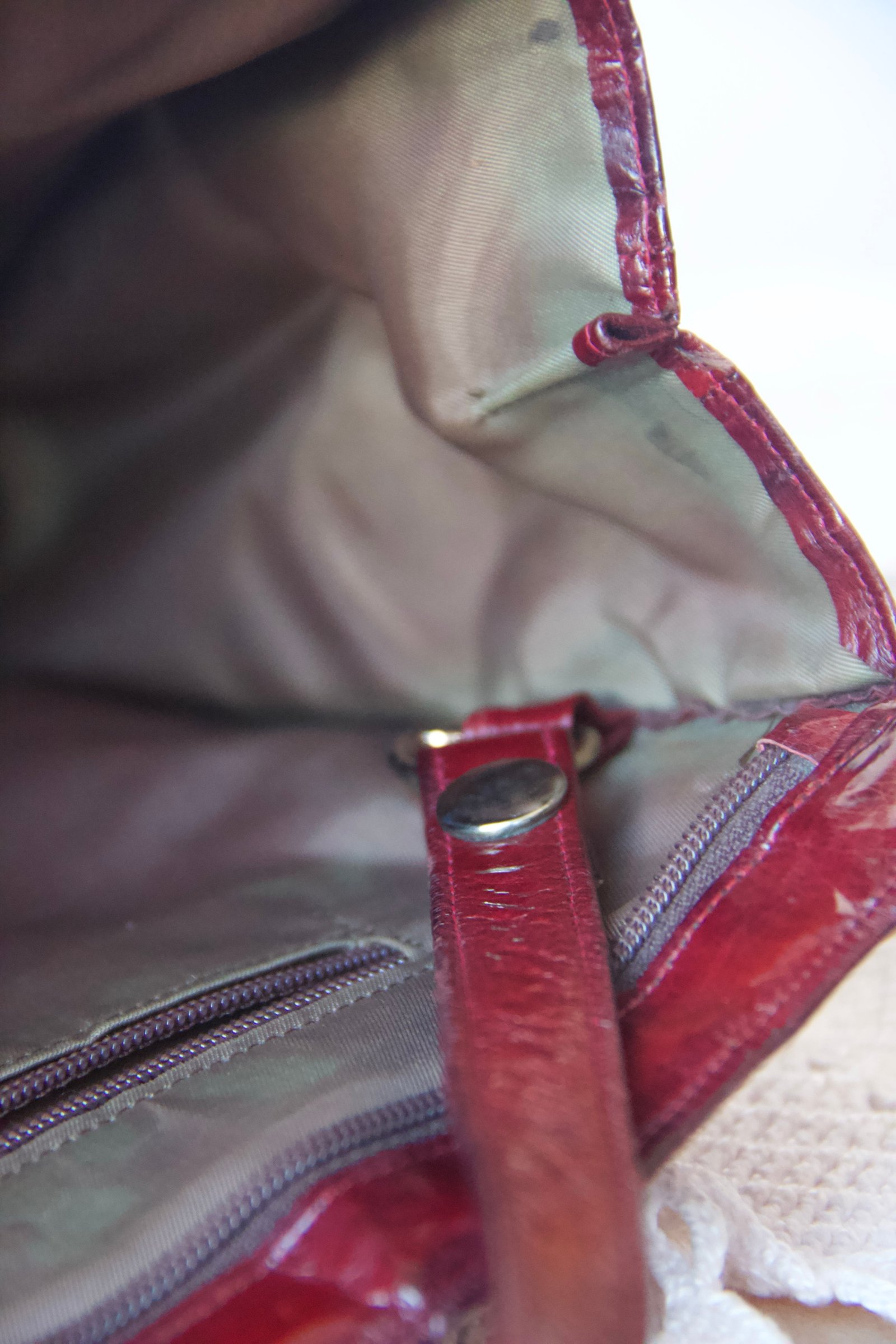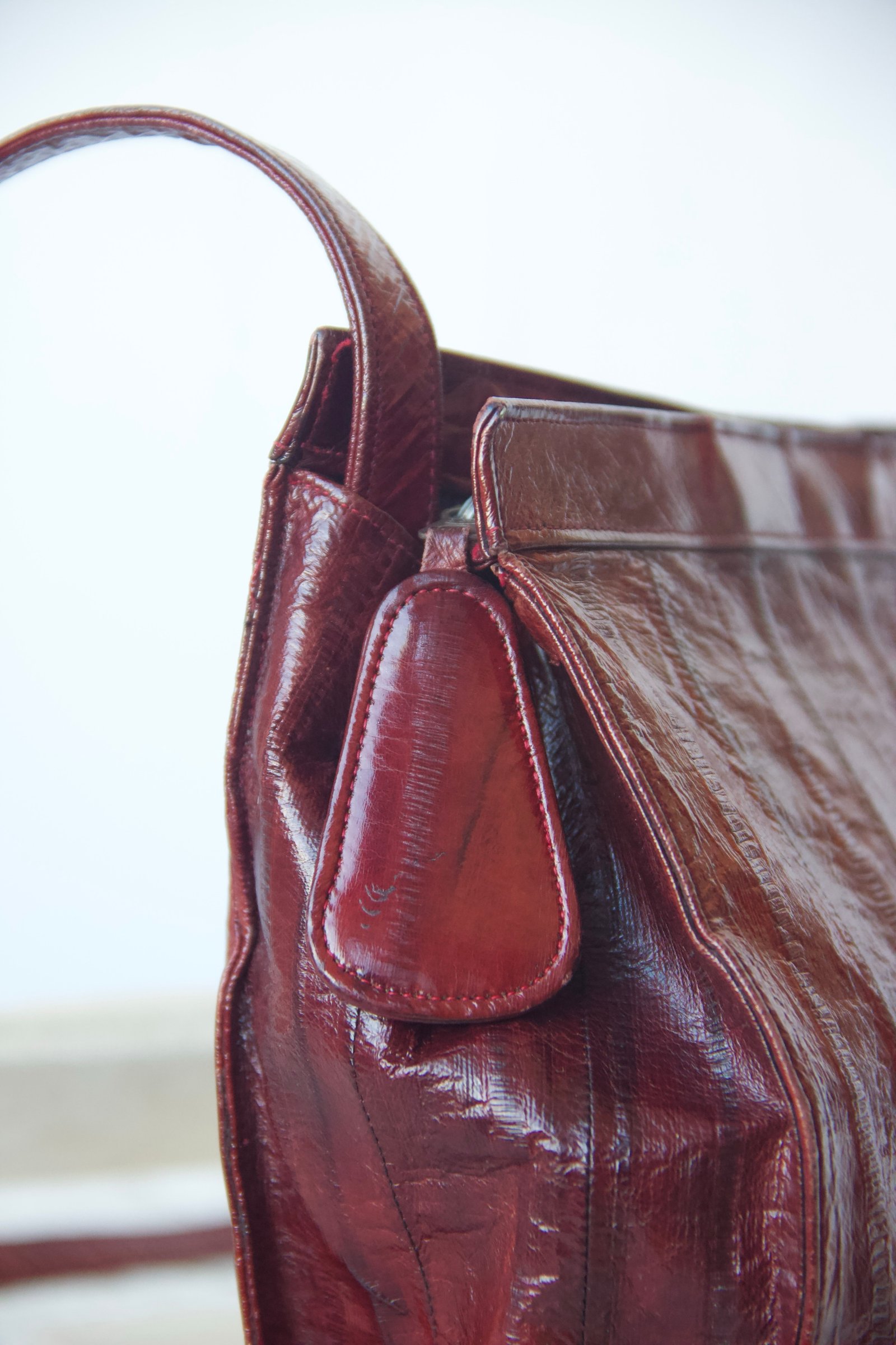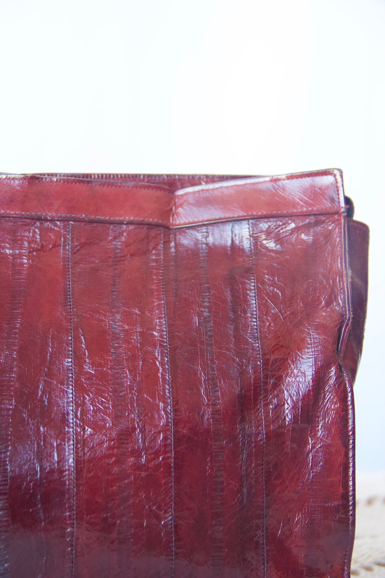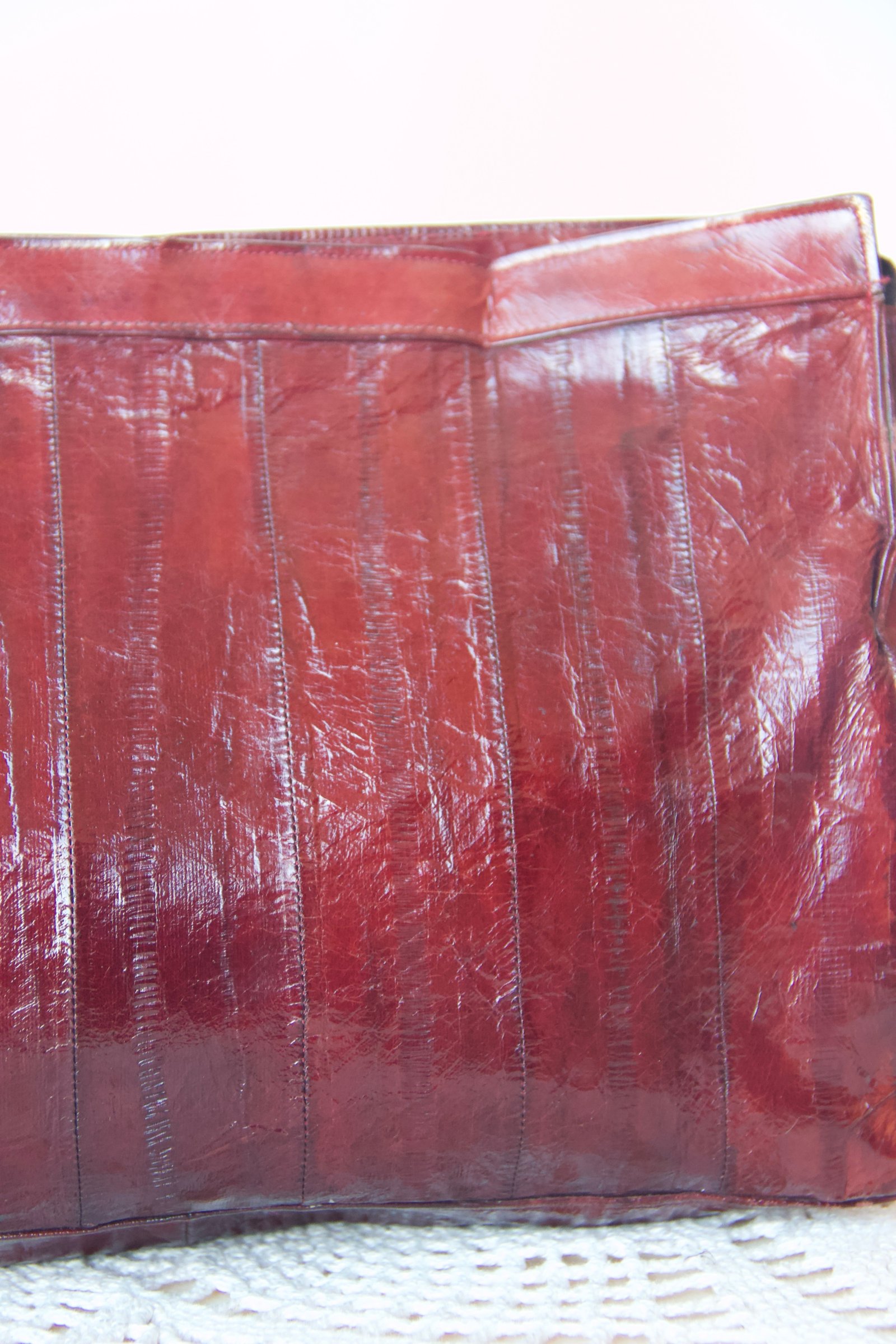 Sac vintage convertible en bandoulière ou en pochette, réalisé en peau d’anguille cramoisie.