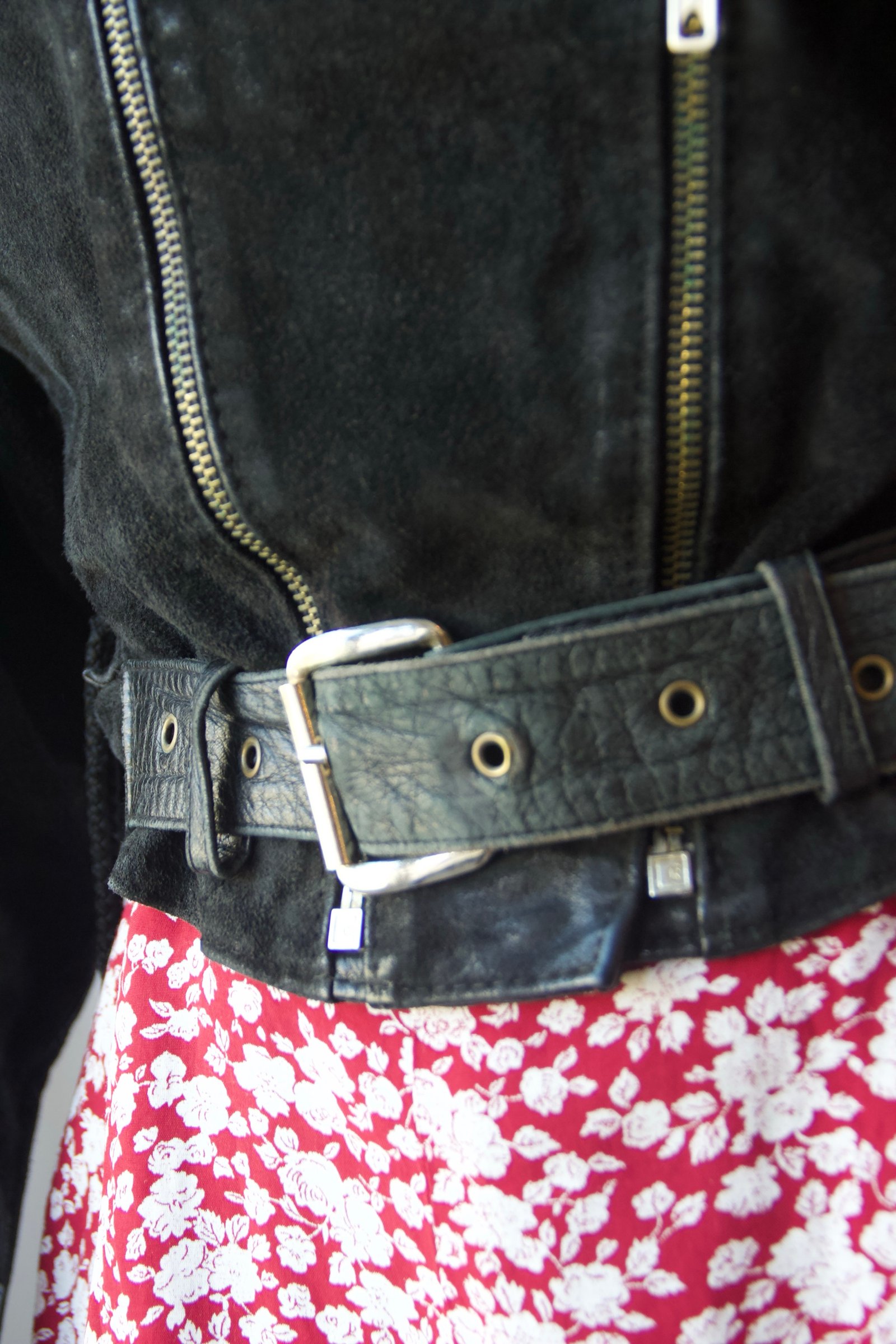 Veste perfecto vintage années 90 en cuir et daim, modèle ceinturé avec doublure légèrement matelassée. Très belle construction avec un jeu de matières qui apporte du relief et du caractère à la pièce.