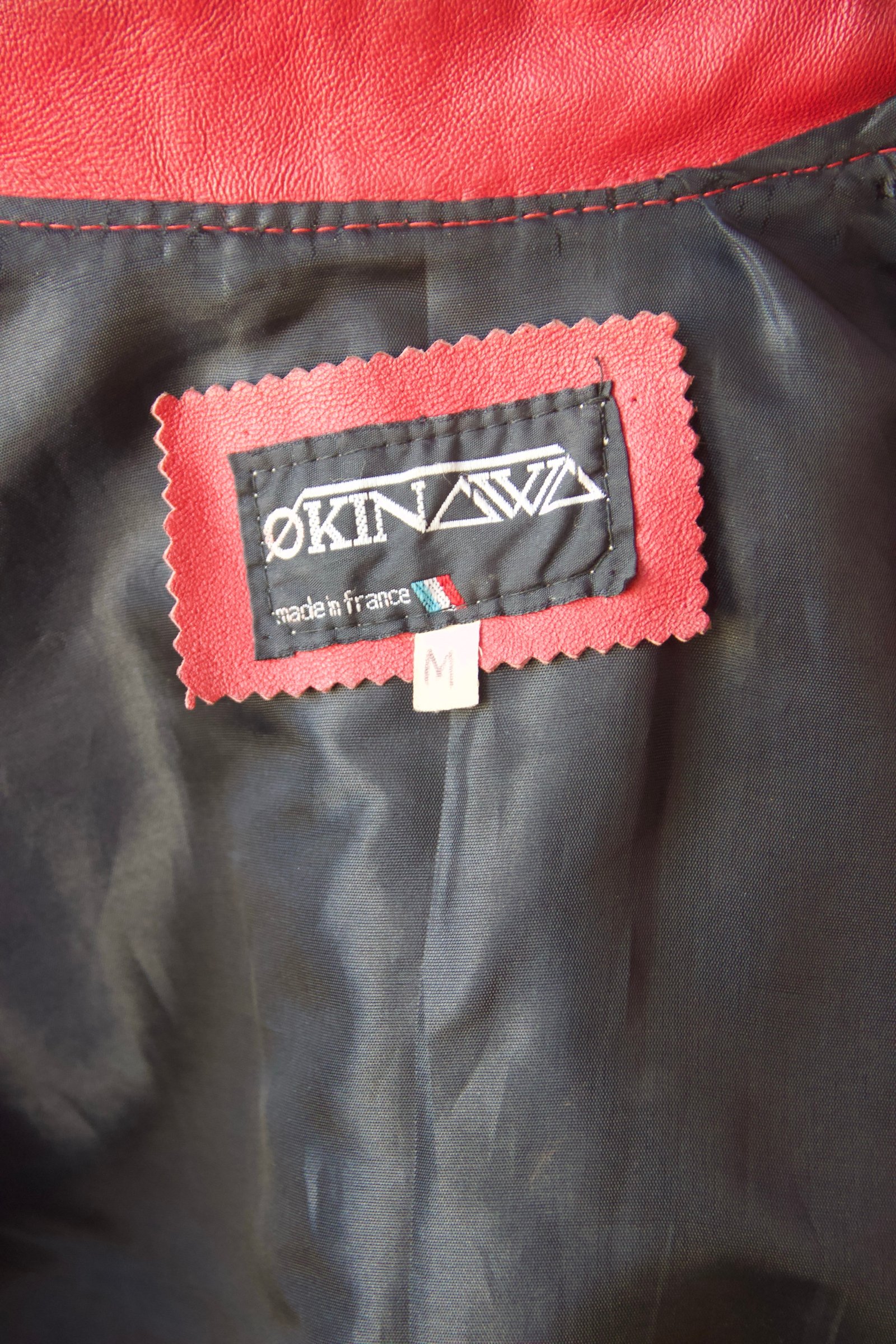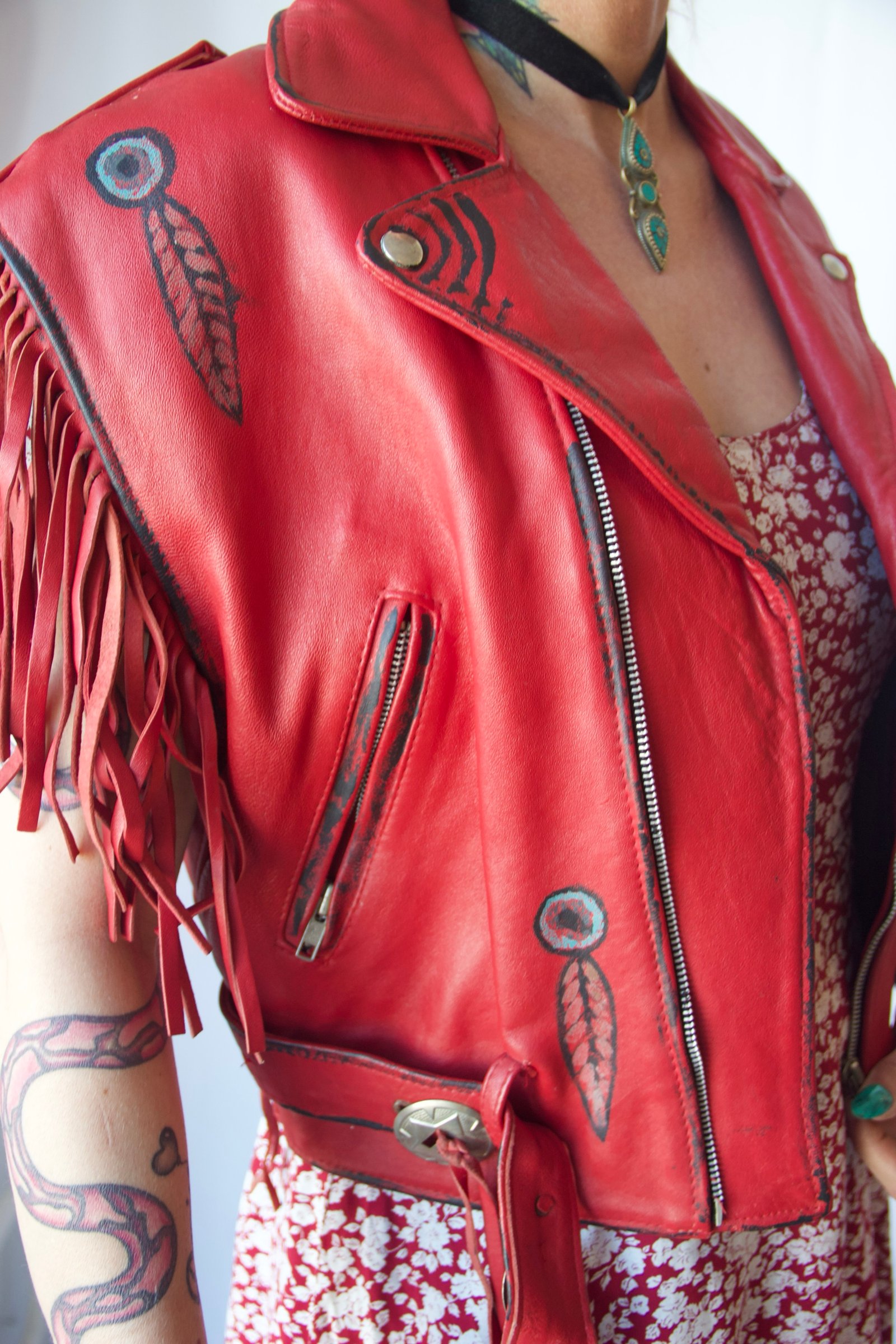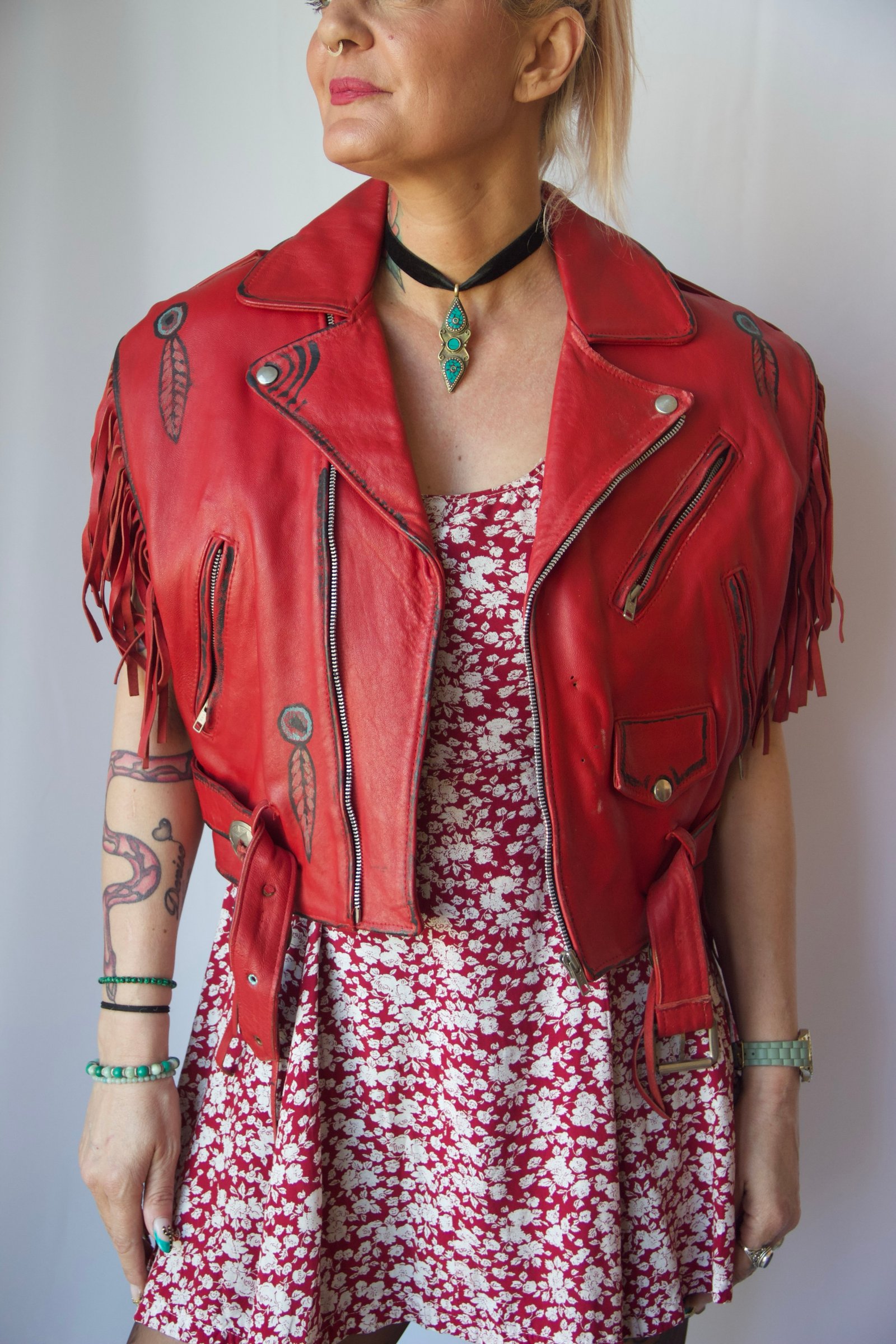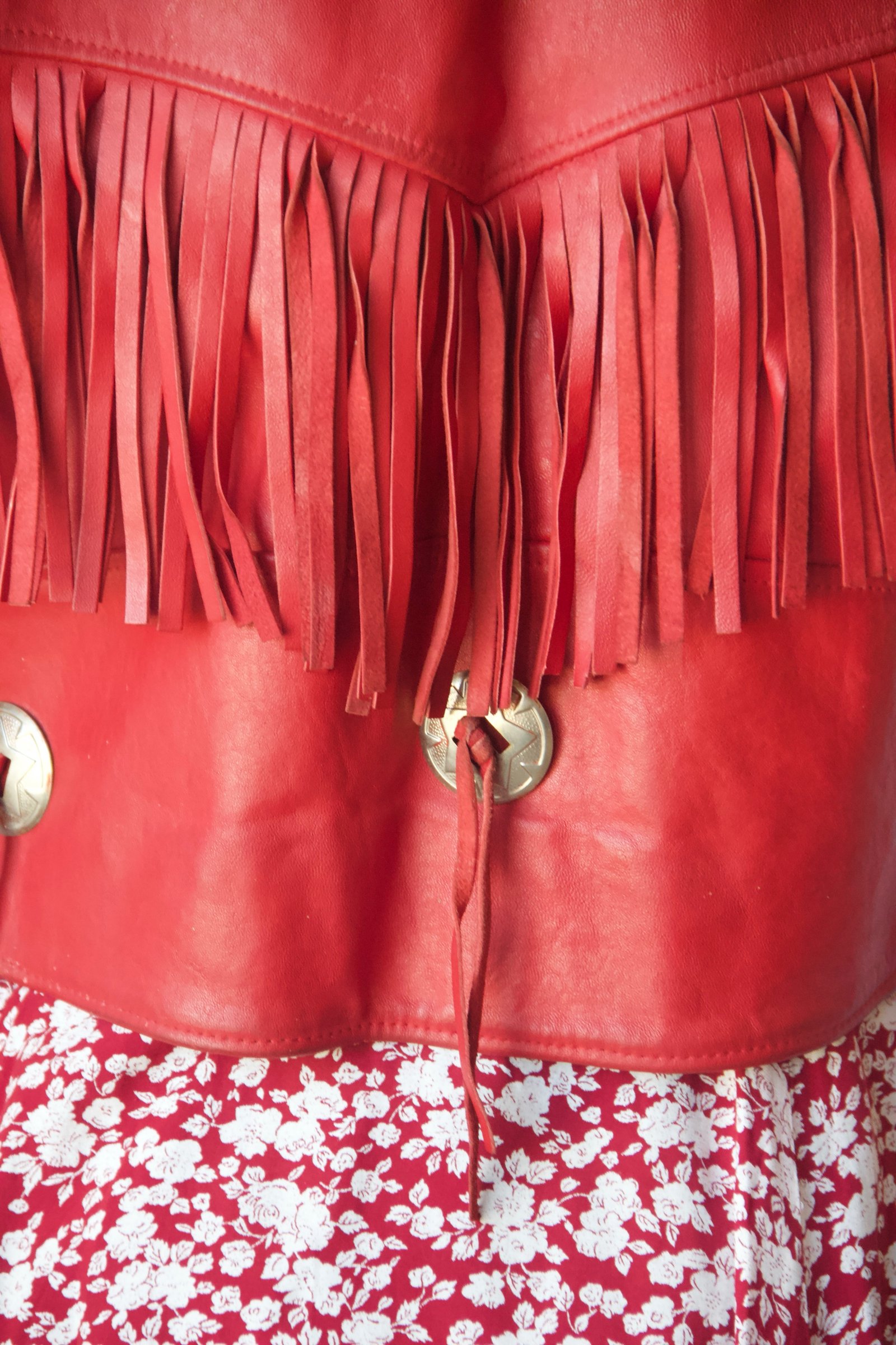 Veste vintage en cuir rouge avec un esprit western affirmé.