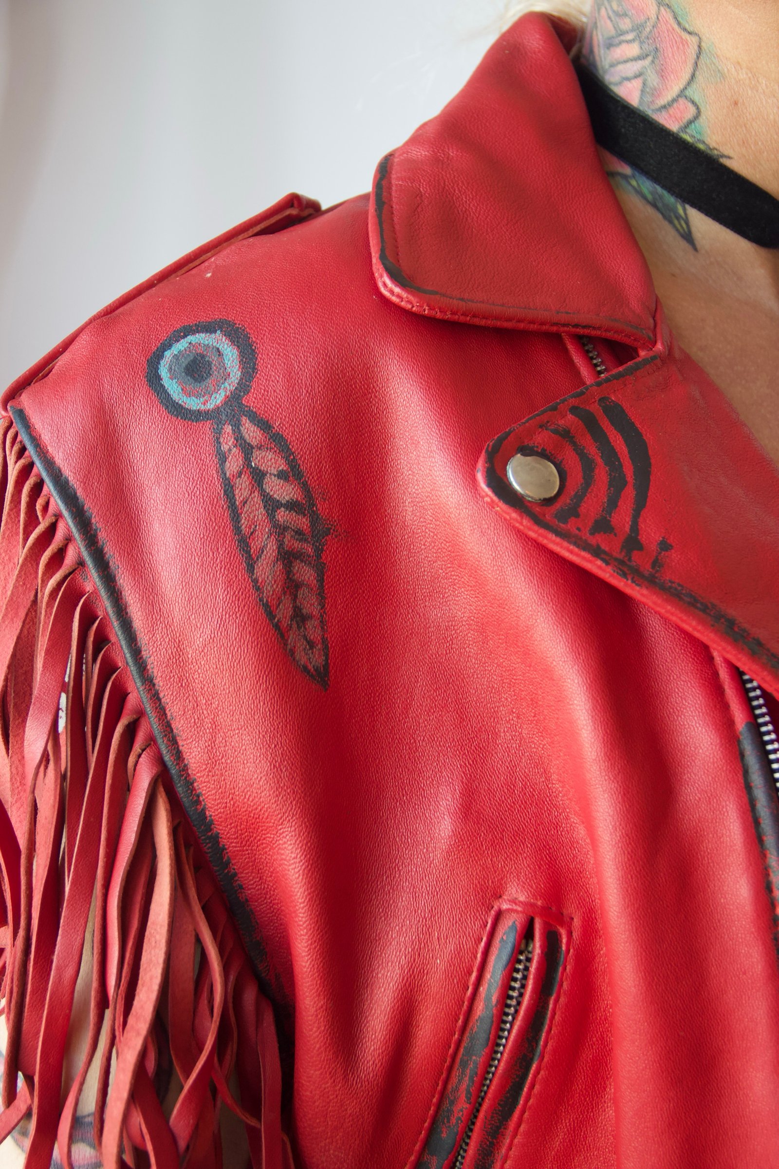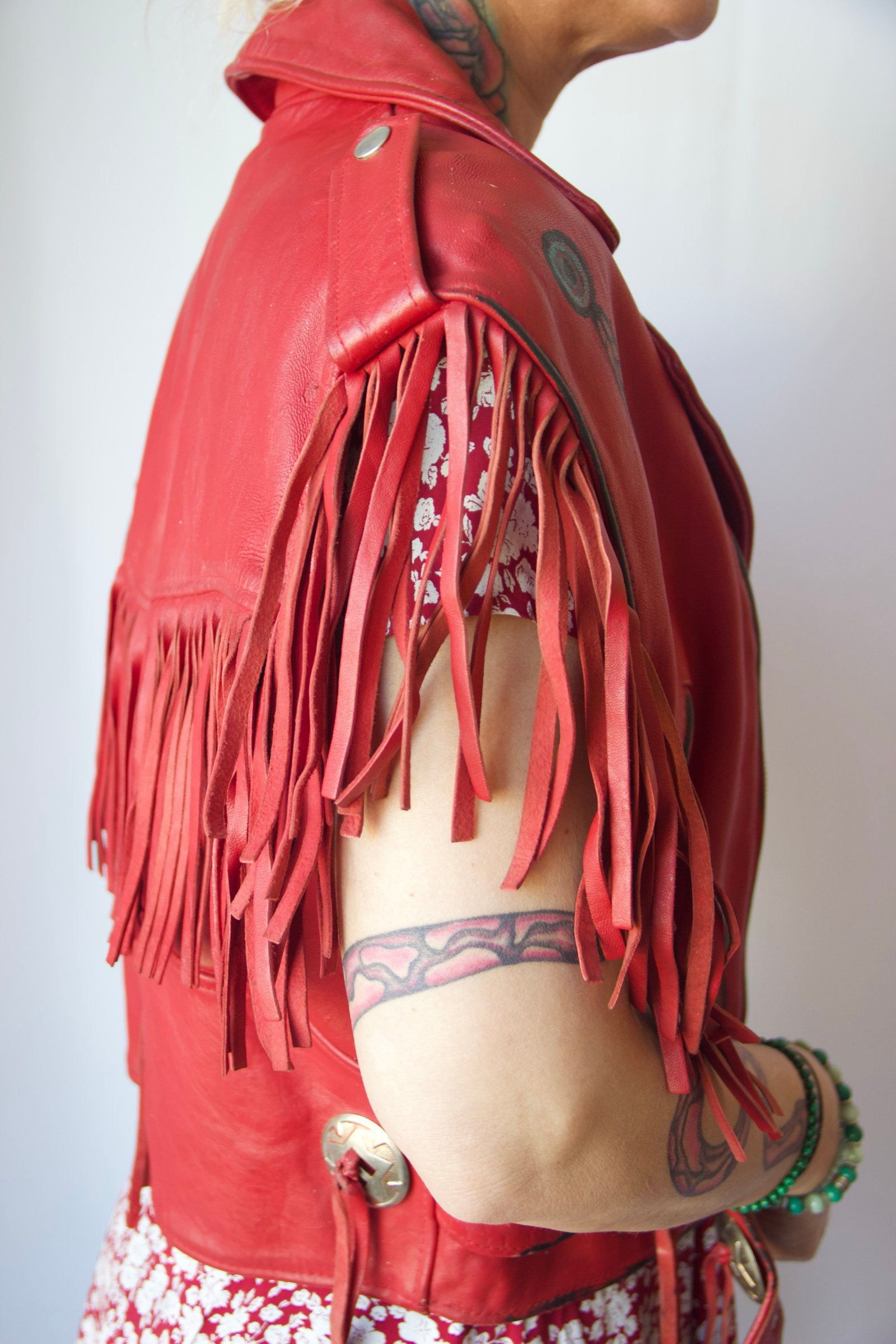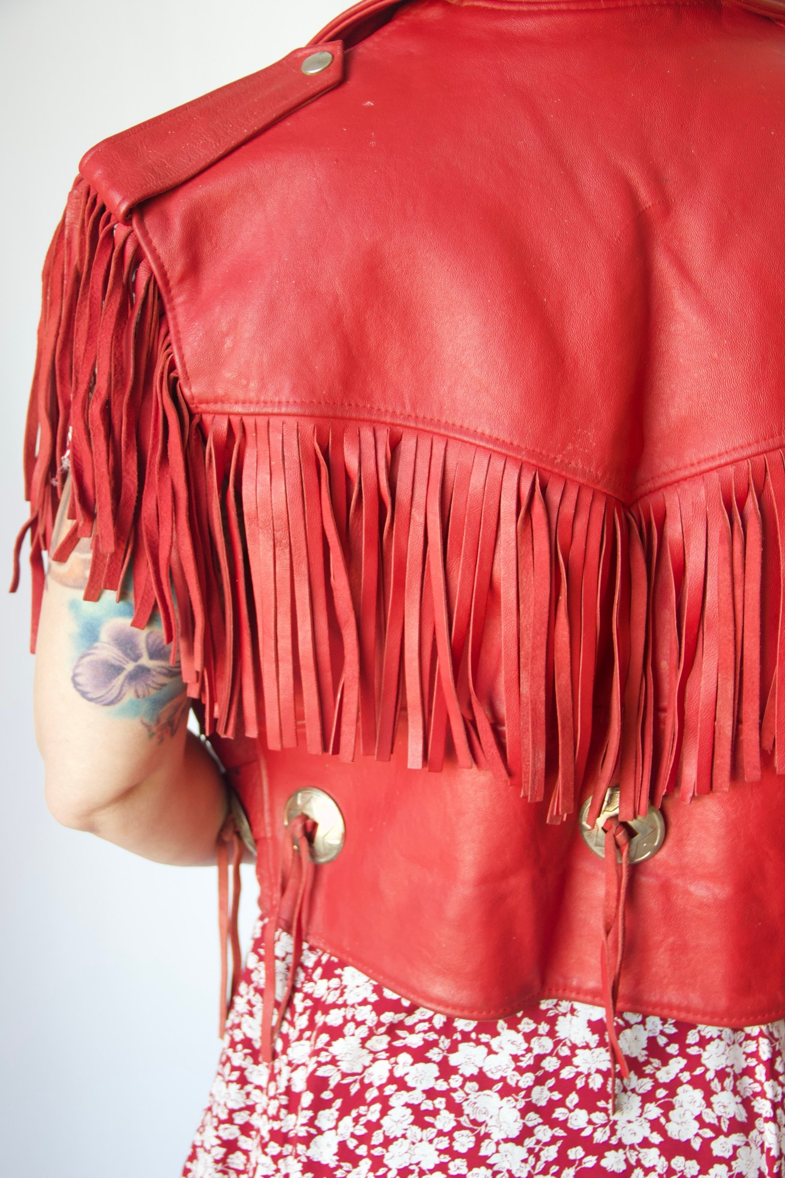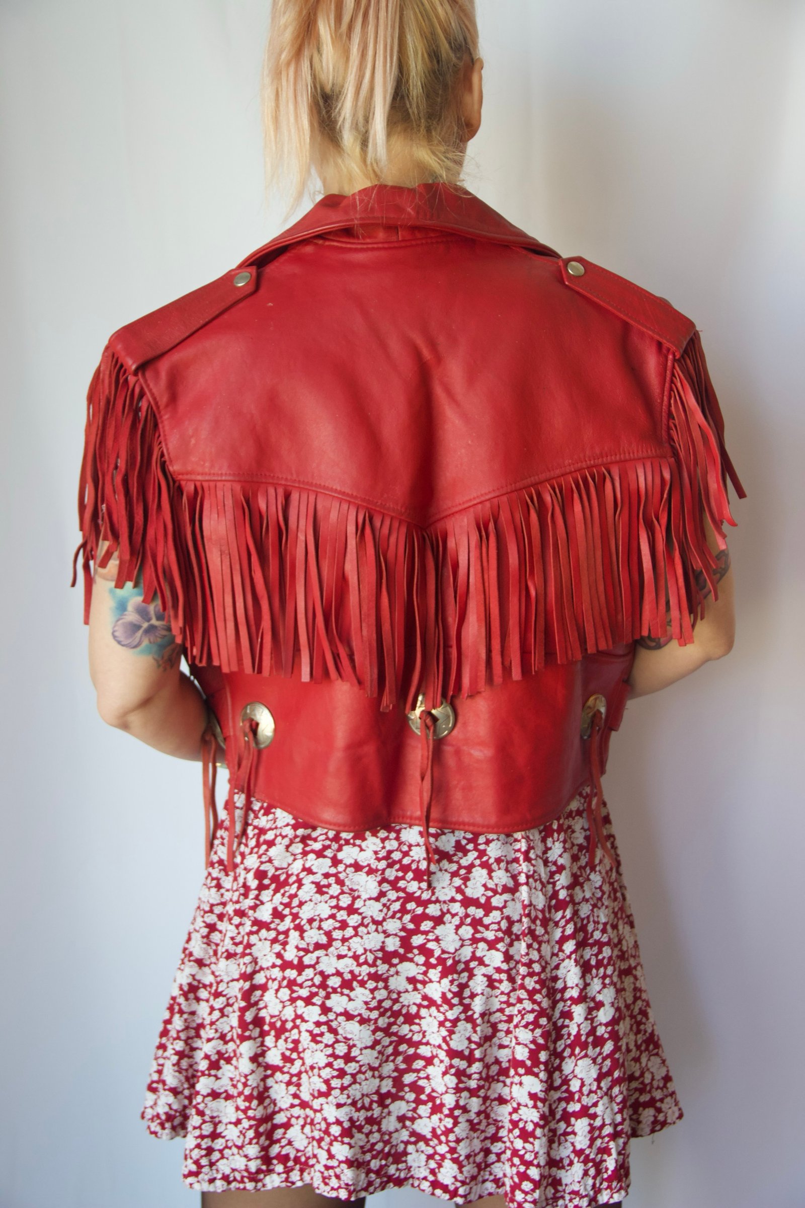 La pièce se distingue par ses nombreuses franges sur les épaules et le dos, qui apportent du mouvement et du caractère. Le cuir est souple avec une belle tenue, et la couleur rouge donne une vraie présence.
