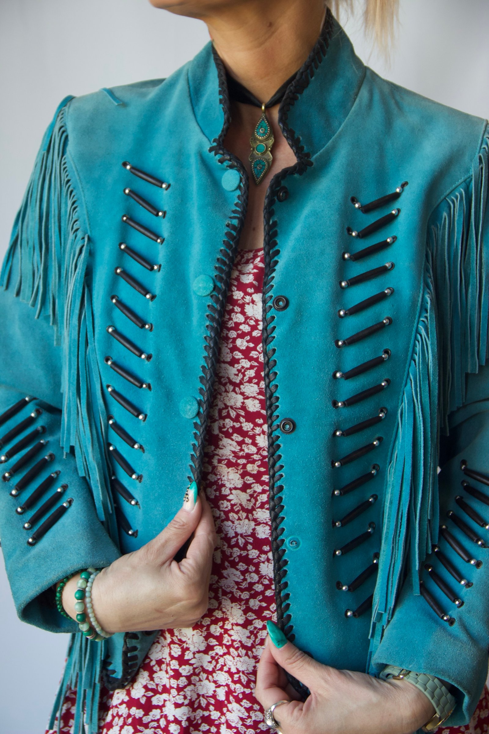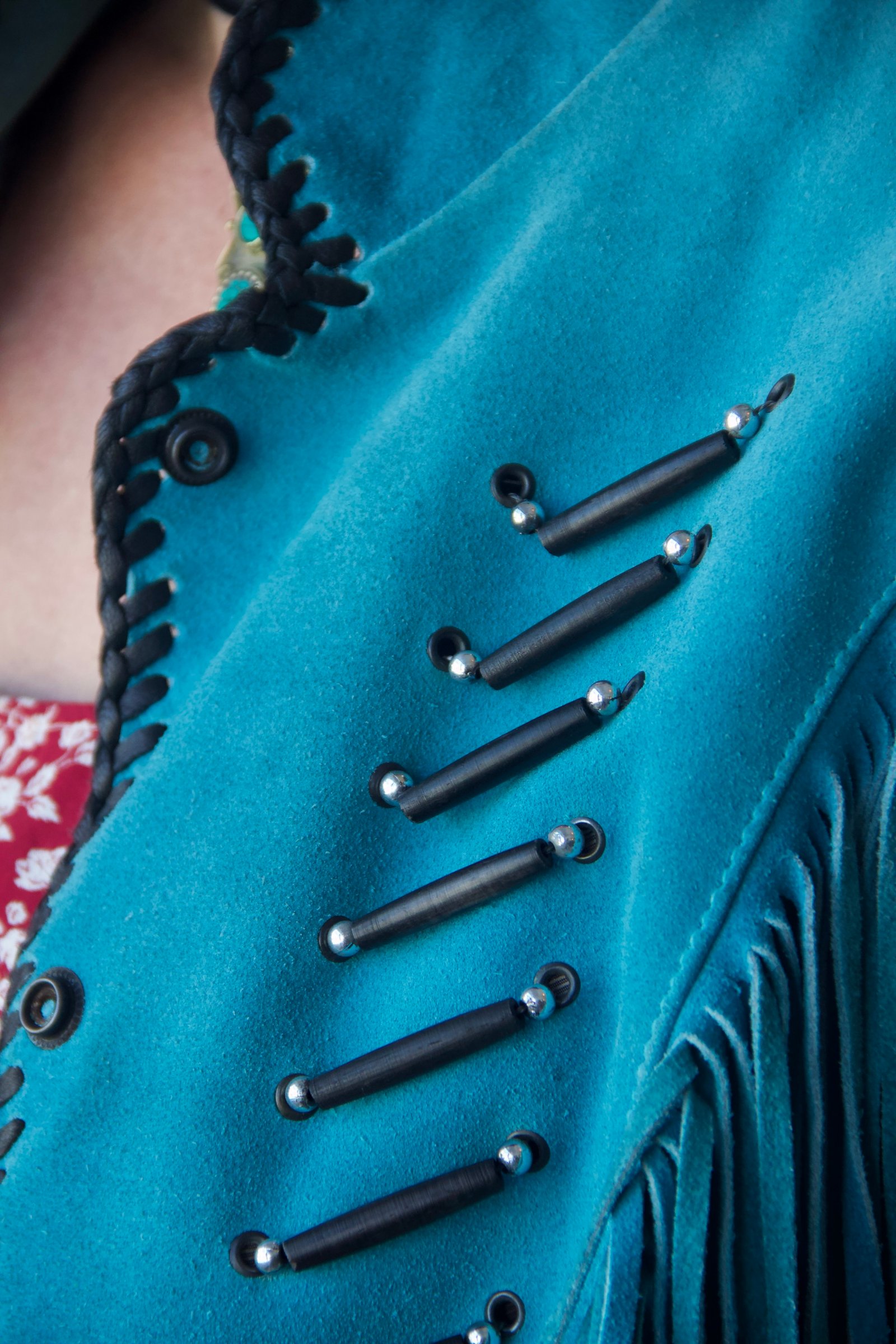 Travail de détails hyper riche avec laçages sur le devant, franges sur les épaules et le dos et finitions travaillées.